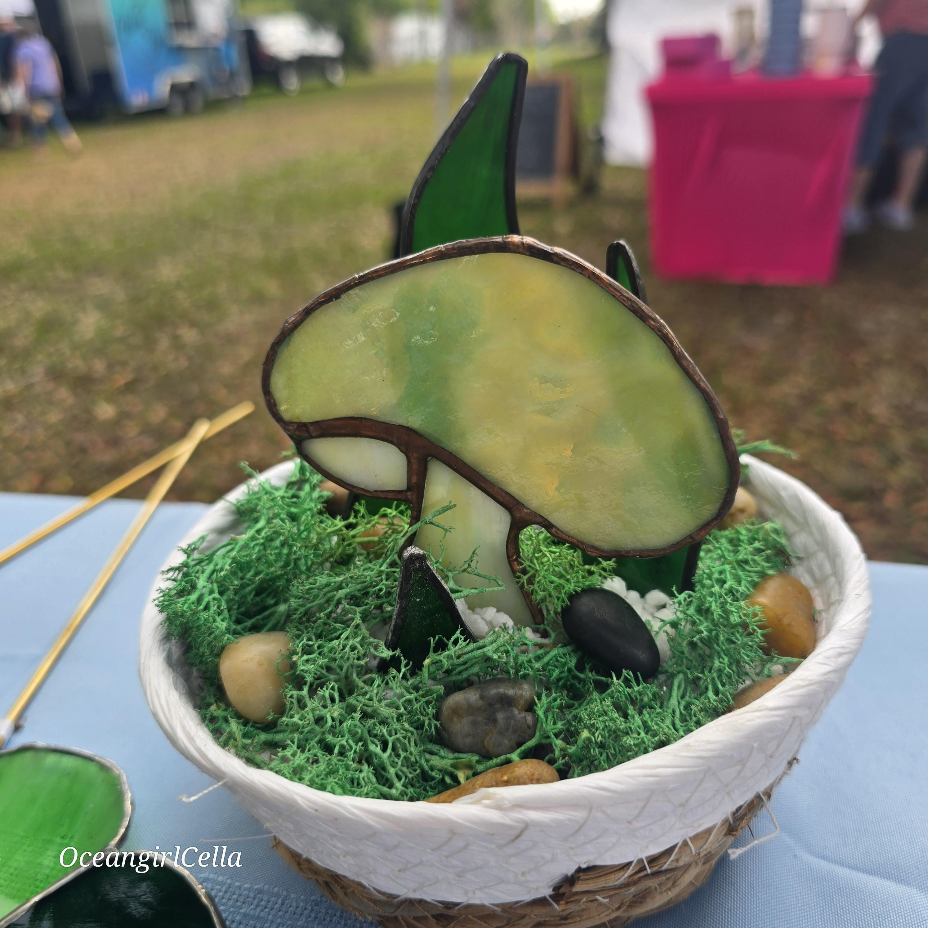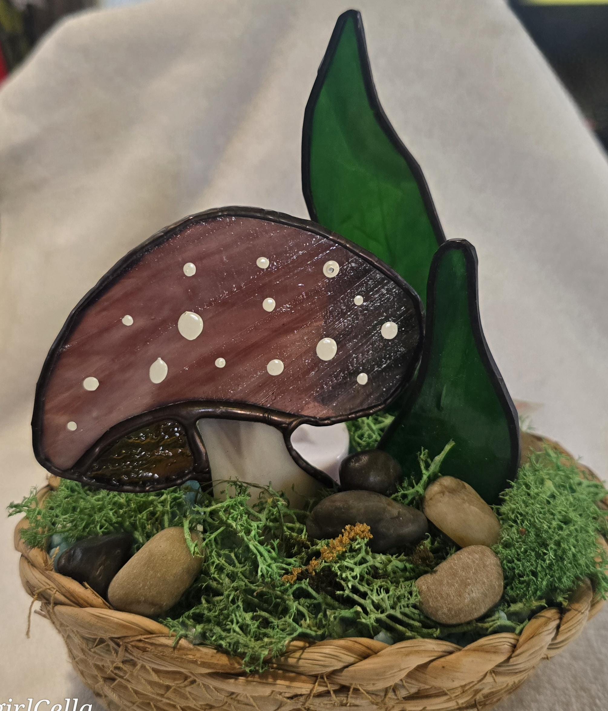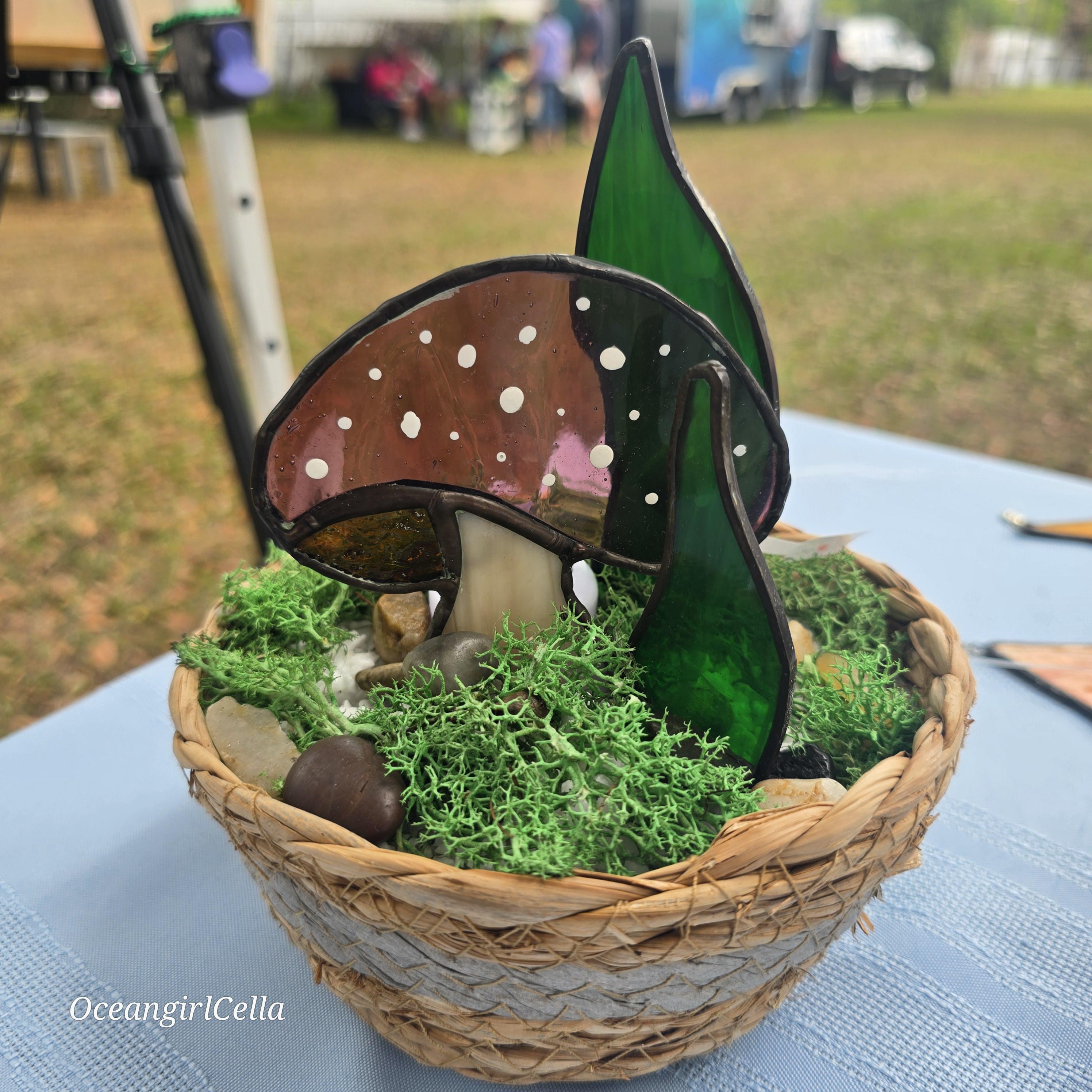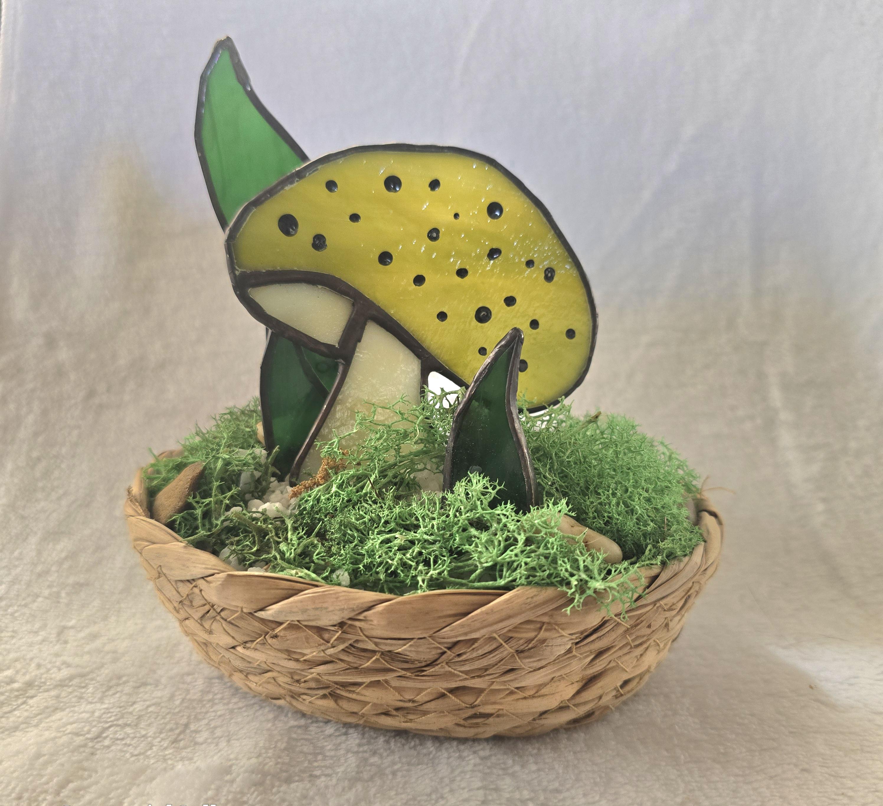 Handmade stained-glass mushroom and snake plants in a weighted basket decorated with moss and stone. comes with a flickering tealight