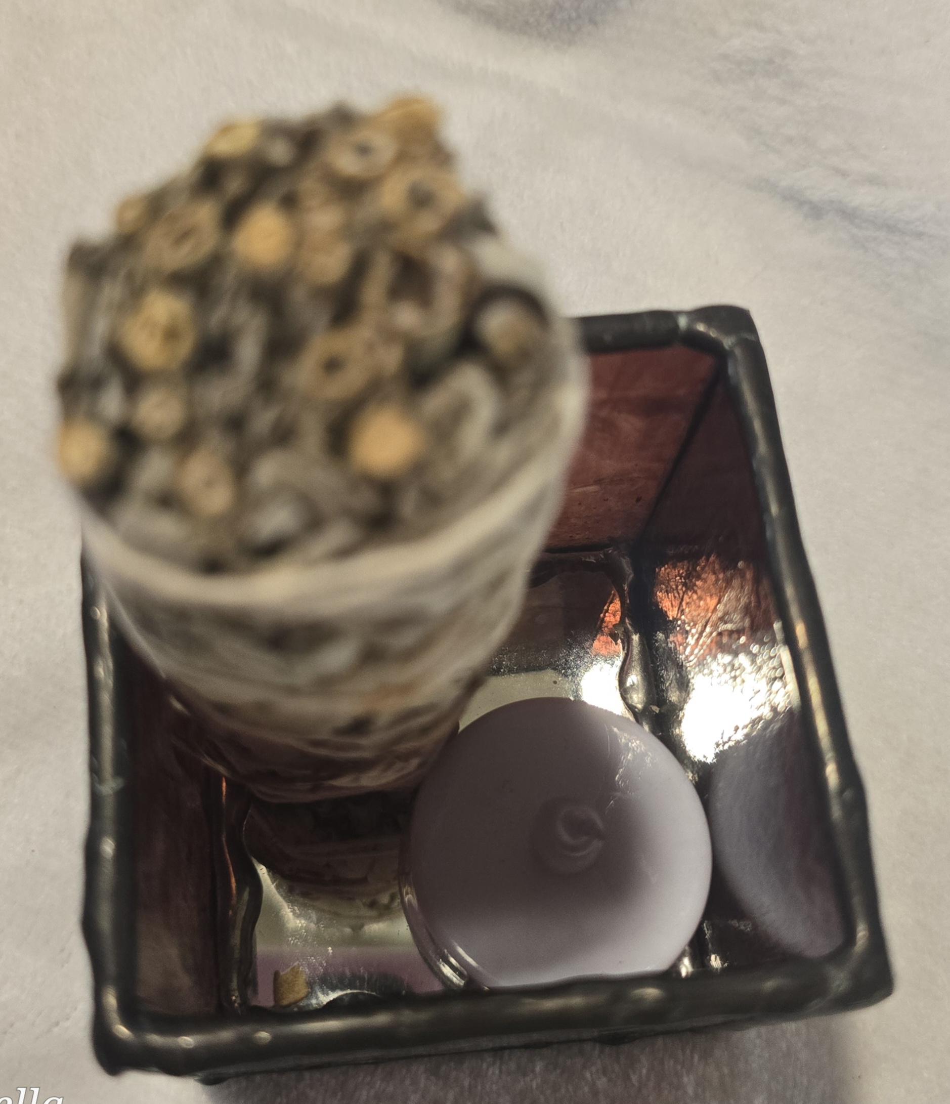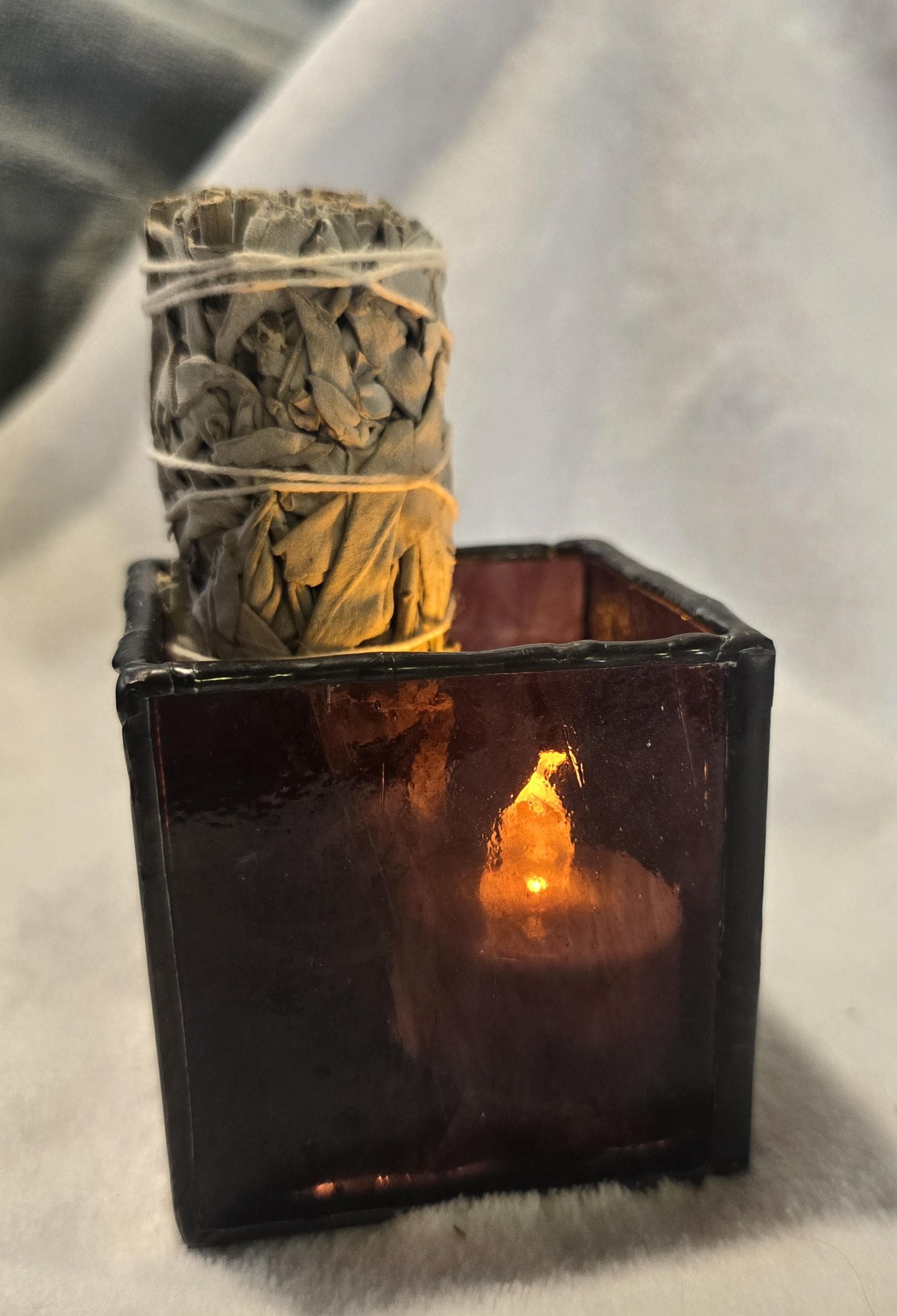 Beautiful deep purple real glass glows with the candlelight. mirror glass base for more reflection and sage because we all need a little sage every now and then