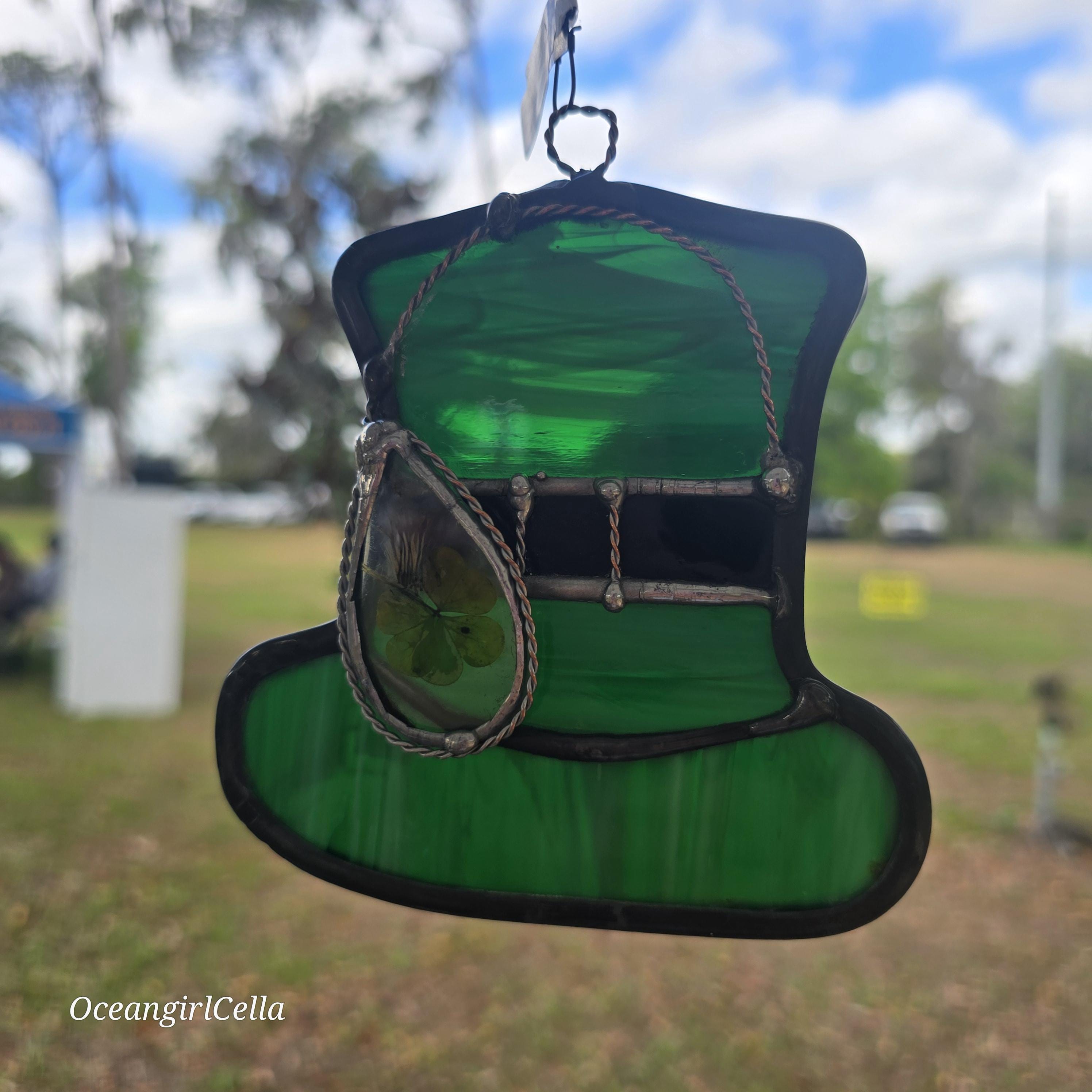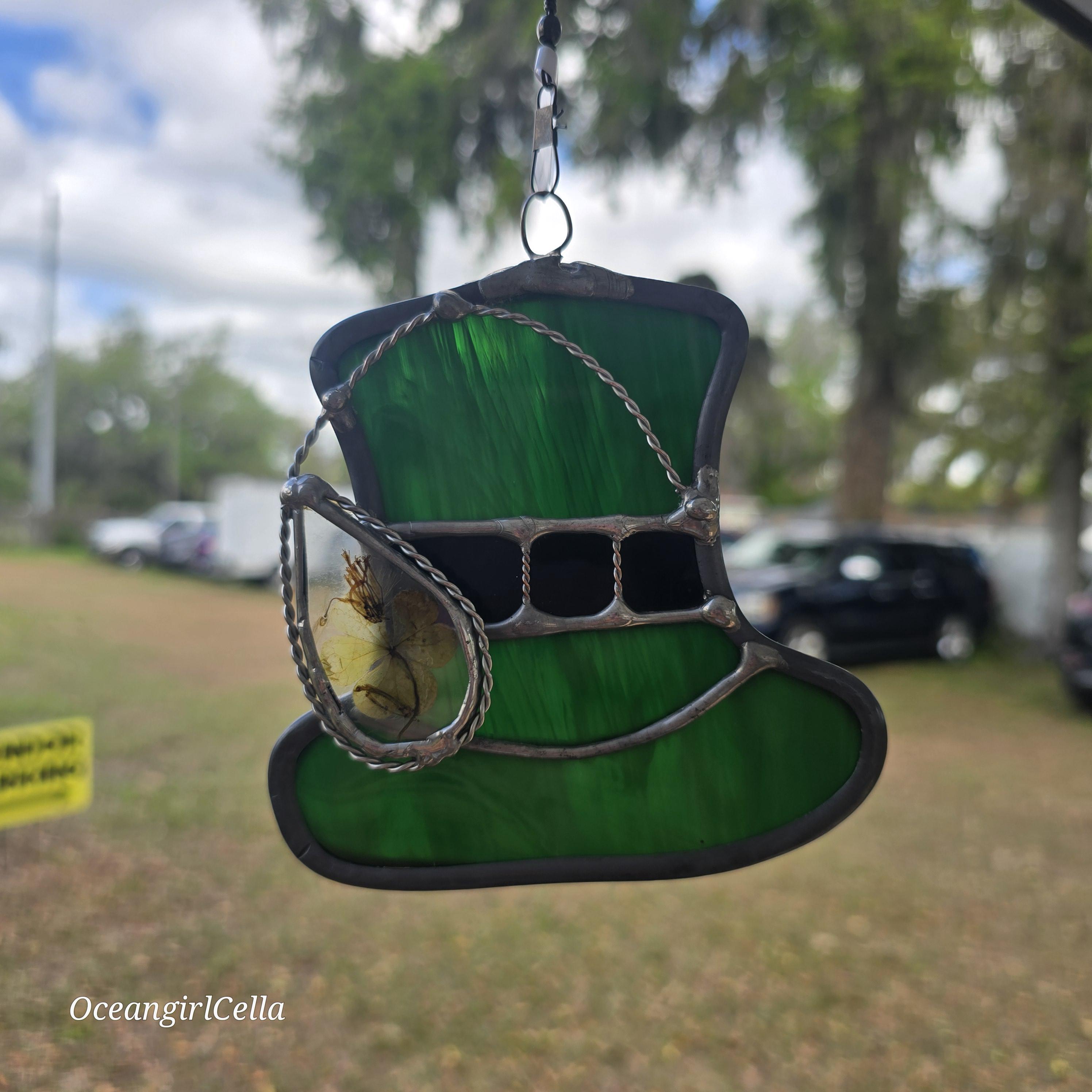 Real stained glass leprechaun hat spinning suncatcher with real pressed clover in wire wrapped glass